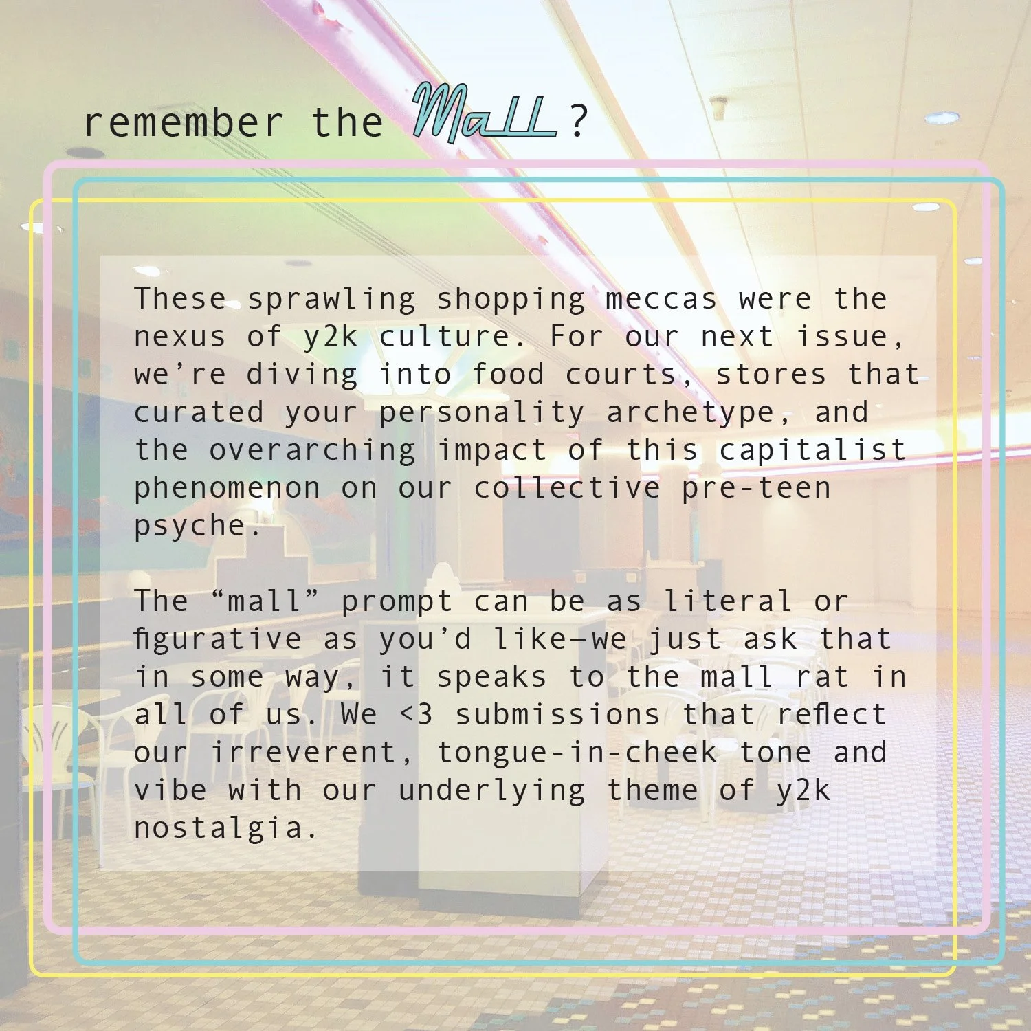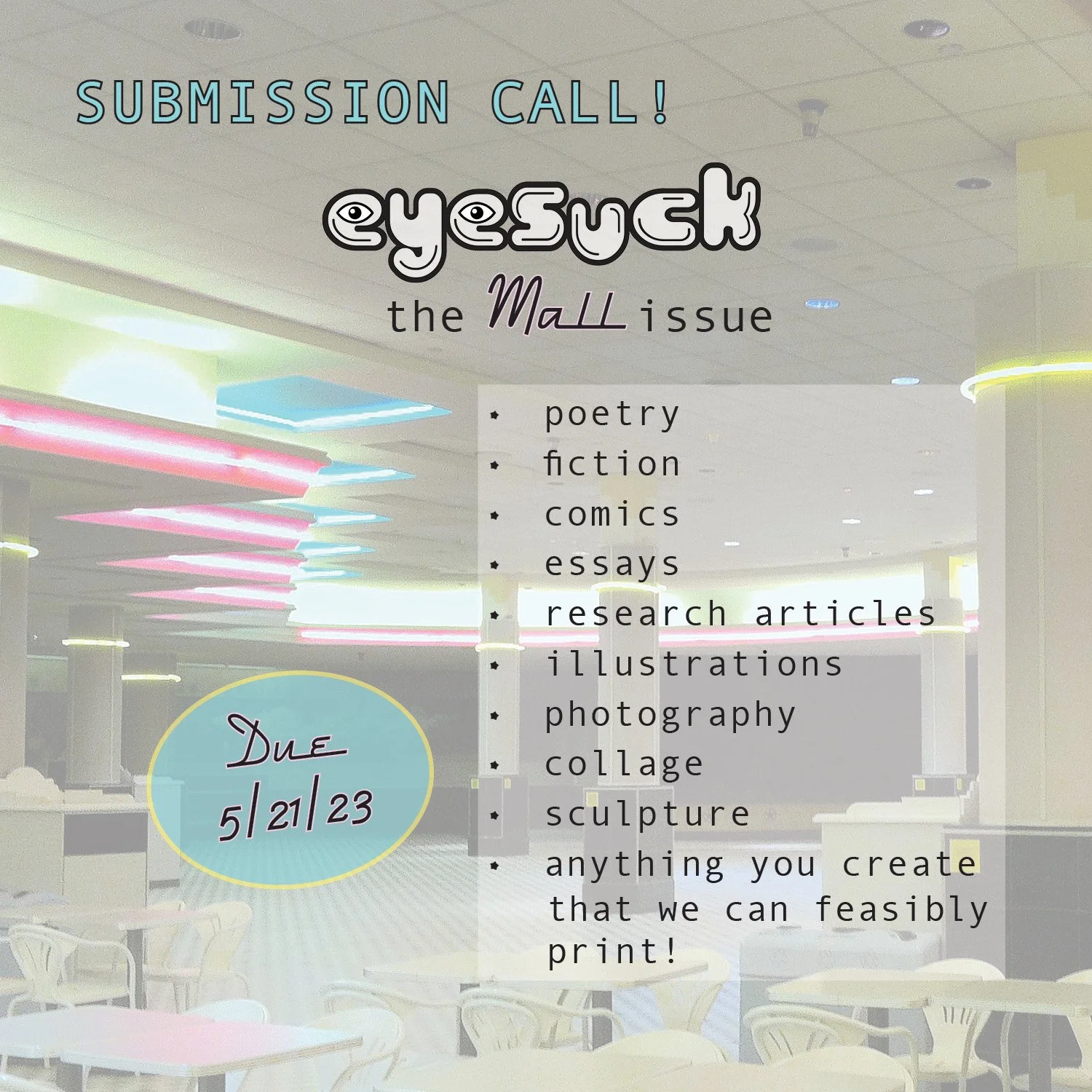 Submissions have unfortunately CLOSED for eyesuck issue 2: the mall issue. Stay tuned for the next submission call!